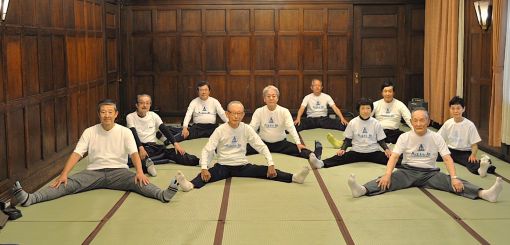 「健体康心」。毎日3分間4つの体操を取り組むことで、健やかな体と、康らかな心を持続するのが、真向法(まっこうほう)の目標。「真向」とは、赤ちゃんがリラックスしているときの姿勢のような、自然で正しい姿勢を指します。大阪倶楽部真向法健康教室の設立は平成16年(2004)。現在、月4回火曜日に集まり、千葉郁子教士の指導を受けて体操に取り組んでいます。上手下手の区別はありません。1日1ミリずつ体を柔らかくしていくことを目指して体操を続けると、血液とリンパ液の流れがよくなり、新陳代謝が活発化して健康や若さを保つことができます。